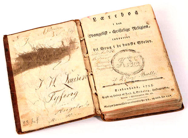 | Martin Luthers lille Katekismus har spillet en stor rolle gennem 300 hundrede års undervisning, og det er uden tvivl den mest brugte skolebog i Danmark. Den første danske oversættelse med forklaringer skyldes Peder Palladius (1503-1560), som var luthersk biskop eller ´superintendant´ over Sjællands Stift i tiden umiddelbart efter reformationen i 1536, men Luthers lille Katekismus er som skolebog udkommet i mange udgaver. Den viste (øverst til højre), som er fra 1780, er endda illustreret. Opslaget viser ´Det femte Bud` - Du skal ikke slaae ihjel, og Luthers forklaring, som børnene skulle lære udenad, lyder i dette tilfælde: Det er: "Vi skulle frygte og elske GUd; ikke skade vor Næstes Legeme, og ey giøre hannem Uret derpaa; men hjelpe og staae hannem bi udi al Livsfare". Udenadslæren af det daglige salmevers og af Luthers forklaringer i "Luthers lille Katekismus" har holdt sig i nogle danske folkeskoler helt frem til sidst i 1950-erne og i enkelte skoler måske endda endnu længere. Yderst til højre i billederne herover ses en moderne udgave af Luthers Katekismus, som indledes med følgende oplysning: "Teksterne fra Luthers lille Katekismus er i denne udgave anført efter den ved kgl. resolution af 25. februar 1953 autoriserede oversættelse af Luthers forklaringer trykt med skrå bogstaver". Bogen, som har undertitlen "En lærebog for den ukonfirmerede ungdom", kan stadig leveres af enhver boghandler i kongeriget, men Katekismus er vist efterhånden ellers gledet ud af det normale pensum i grundskolen, efter gennem flere århundreder at have været den mest ´sejlivede´ skolebog i dansk skolehistorie efter de tusindvis af ABC´er, som er slidt op gennem århundreder. |