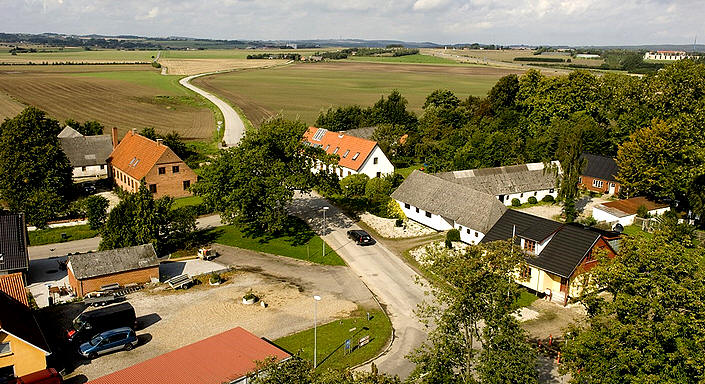 af marker og ligger trukket let tilbage fra vejen mod øst, hvorved der er opstået en smal